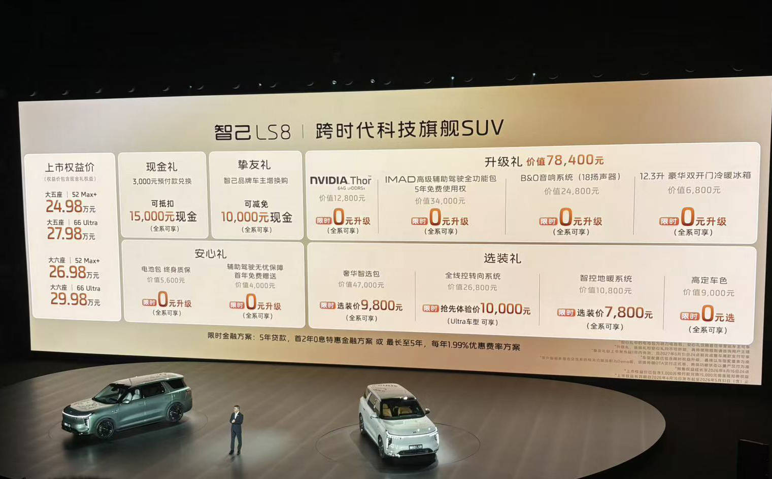 智己汽车近日推出全新中大型SUV——智己LS8,正式进军高端新能源市场。新车共发布4款配置车型,官方指导价区间为26.18万至31.18万元,叠加上市权益后实际售价下探至24.98万至29.98万元。作为品牌旗舰SUV,LS8提供5座/6座双版本选择,基于800V高压平台打造,搭载恒星超级增程动力系统,CLTC工况下最大综合续航里程达1605公里。在动力架构方面,新车提供后驱与四驱双动力方案。后驱