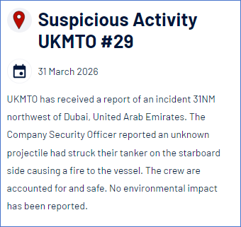 航运界网消息,当地时间3月31日,美以对伊朗军事行动进入第32天。霍尔木兹海峡附近又新增1起疑似遇袭事件根据航运界网的跟踪报道,英国海上贸易行动办公室(UKMTO)当地时间3月31日发布安全通告称,收到了阿联酋迪拜西北31海里处发生的一起疑似遇袭报告,1家公司安保人员报告称,一枚不明弹丸击中了油轮右舷,导致船舶起火。随后,科威特石油公司(KPC)表示,当地3月31日凌晨,2011年建造的31966