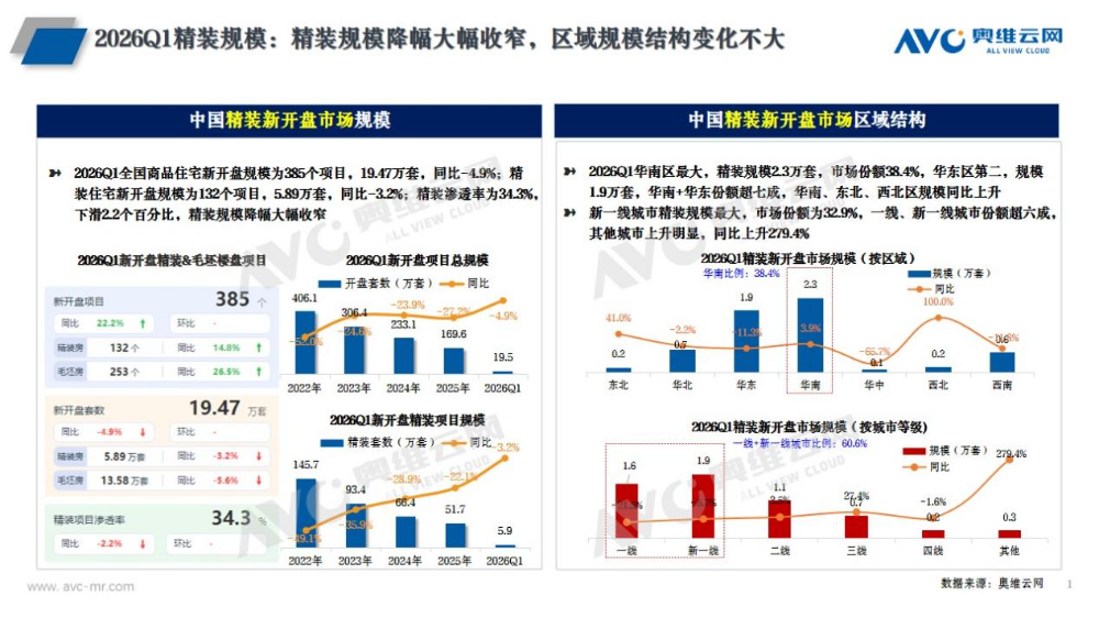 2026年一季度,政策层面,中央坚持着力稳定房地产市场、推动房地产高质量发展总基调,持续强化房地产市场稳定发展的顶层设计。经济层面,中国房地产行业仍处于筑底调整过程中,但各项指标规模持续收缩、核心指标跌幅有所改善,全国精装修商品住宅新开盘体量出现扭转性增长。精装规模:一季度新盘132个(同比+14.8%) 、5.89万套(同比-3.2%),3月迎来规模回正喜讯,市场呈现“供给面修复拉动市场筑底企稳