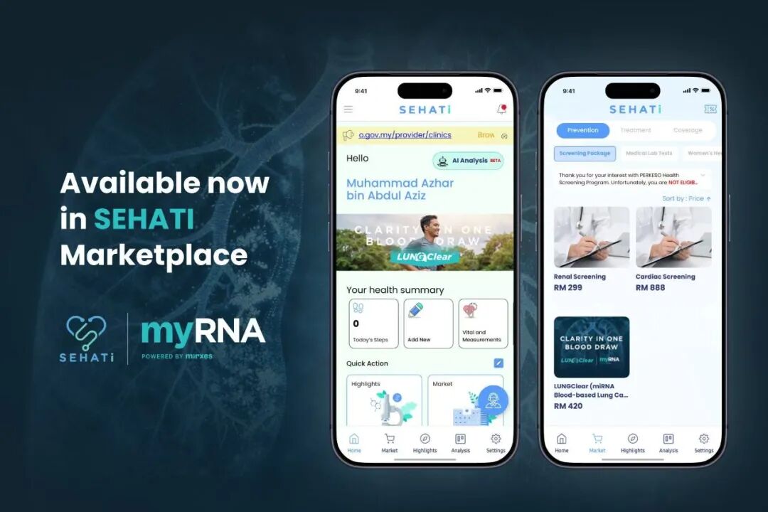 4月22日,Mirxes觅瑞(股票代码:2629.HK)马来西亚合资公司MyRNA迎来重大里程碑突破:创新肺癌早筛产品LUNGClearTM,正式获得马来西亚官方认可,全面进驻马来西亚国家社会保障体系及雪兰莪州政府健康筛查试点计划。国家级平台接入,1300家诊所联动上周,LUNGClearTM正式接入马来西亚社会保障组织旗下统一数字健康平台SEHATi,率先覆盖巴生谷地区1300家签约诊所,并规划