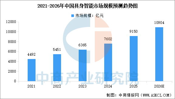 在政策与资本双重驱动下,中国具身智能市场规模持续扩大。中商产业研究院发布的《2025-2030年中国具身智能市场调研分析及投资前景研究预测报告》显示,2025年中国具身智能市场规模约9150亿元,同比增长20.4%。中商产业研究院分析师预测,2026年中国具身智能市场规模将达到10904亿元。
