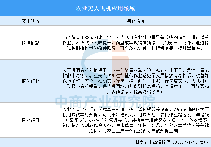 农业无人飞机是指应用于农业场景的无人机,主要用于产量优化以及监视农作物生长和农作物生产。农业无人飞机体积相对小巧灵活,更适合在管理环节中进行精密作业,可有效替代人工操作。
