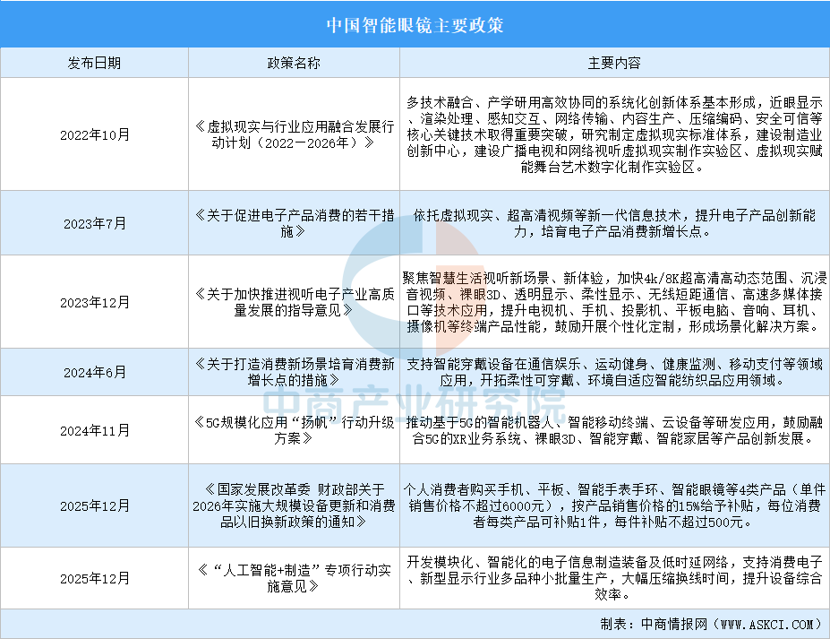中国智能眼镜行业的政策演进,经历了从“产业规划布局”到“技术创新支持”,再到“消费端直接补贴”的递进式推进。在顶层战略层面,智能眼镜归属于虚拟现实(VR)与增强现实(AR)这一前沿领域。在技术研发层面,国家陆续出台了《关于促进电子产品消费的若干措施》《虚拟现实与行业应用融合发展行动计划(2022—2026年)》等政策,鼓励虚拟现实等新一代信息技术。
