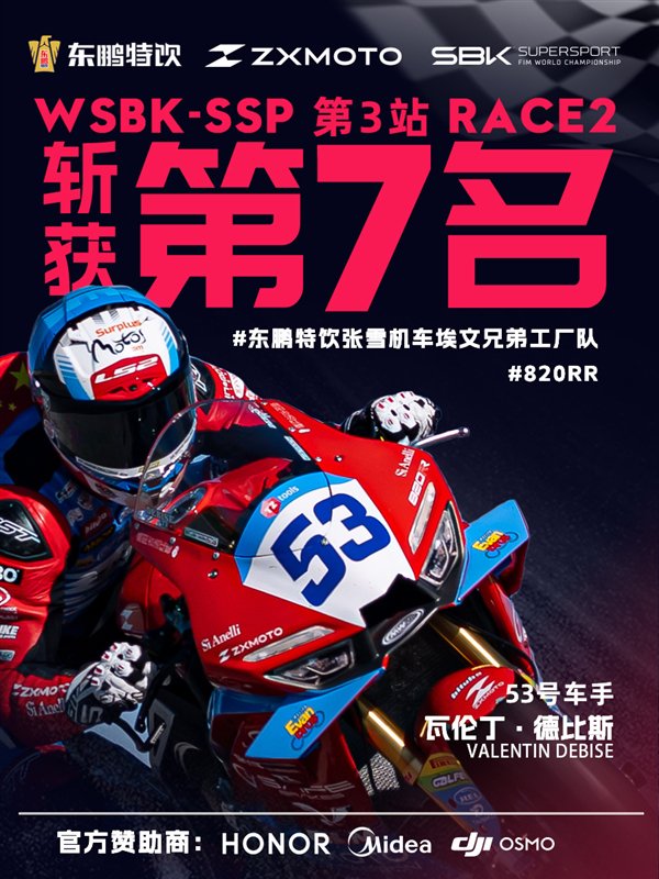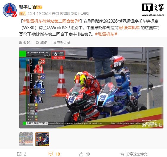 IT之家 4 月 19 日消息,2026 世界超级摩托车锦标赛(WSBK)第三站荷兰站的比赛于 4 月 17 日至 19 日在阿森赛道举行。在今日的 WorldSSP 组别第二轮正赛中,中国摩托车制造商张雪机车的 53 号法国车手瓦伦丁 · 德比斯最终收获第七名。荷兰站正赛分两回合进行,两场正赛的积分均计入总成绩排名。在此前一日进行的第一回合正赛中,德比斯一度处于领跑位置,但最后被罚退至第四名完赛