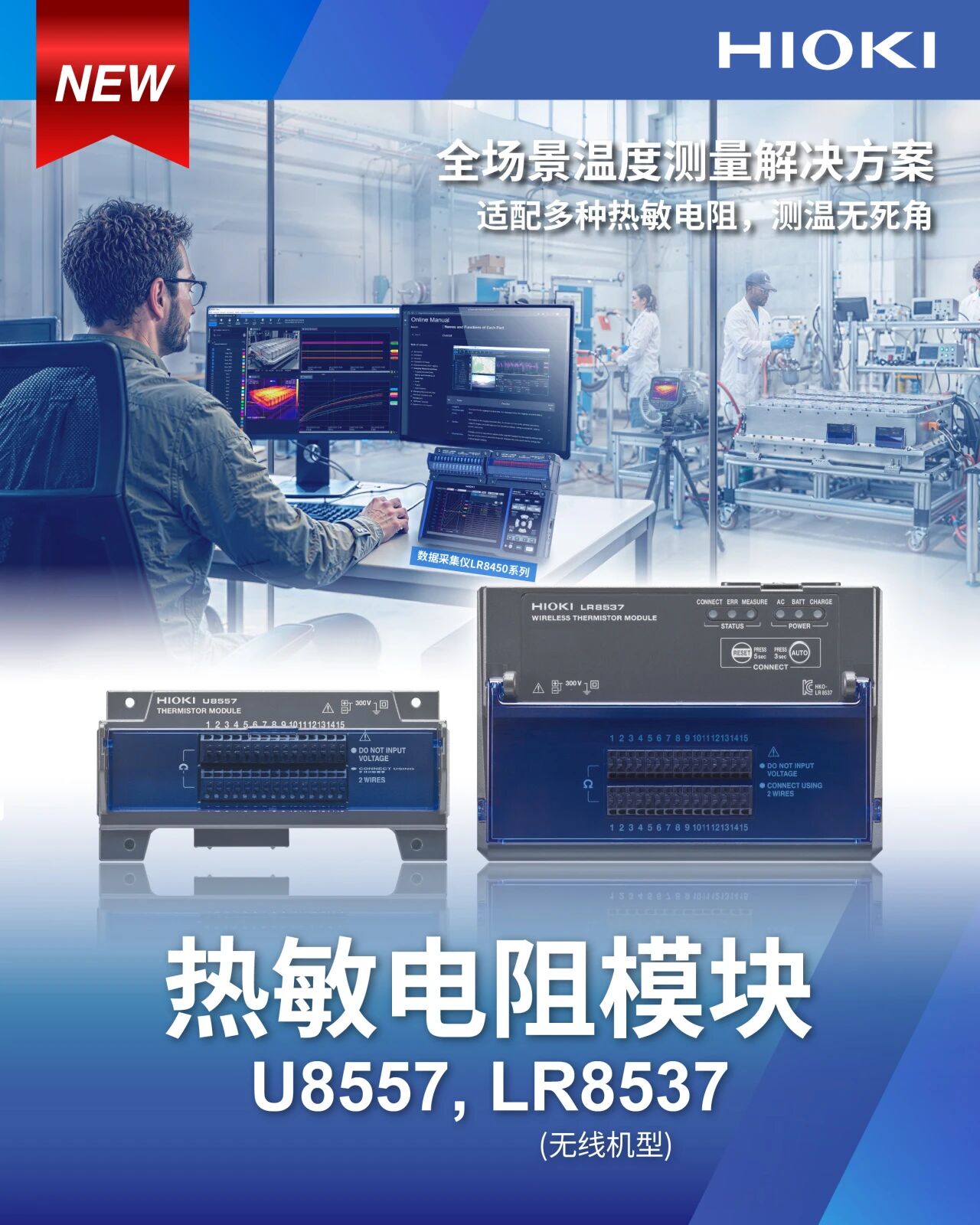 在电动汽车与能源领域研发不断提速的当下,精准、高效的温度测量成为工程师们的核心需求。HIOKI 日置重磅推出两款热敏电阻模块 ——直连型 U8557 和无线型 LR8537,搭配全新发布的新一代测量数据软件 GENNECT Space,从硬件采集到软件分析实现全流程升级,为汽车、工业及能源领域的温度测量与数据处理提供一站式解决方案。热敏电阻模块U8557与LR8537为15通道热敏电阻 / 电阻测