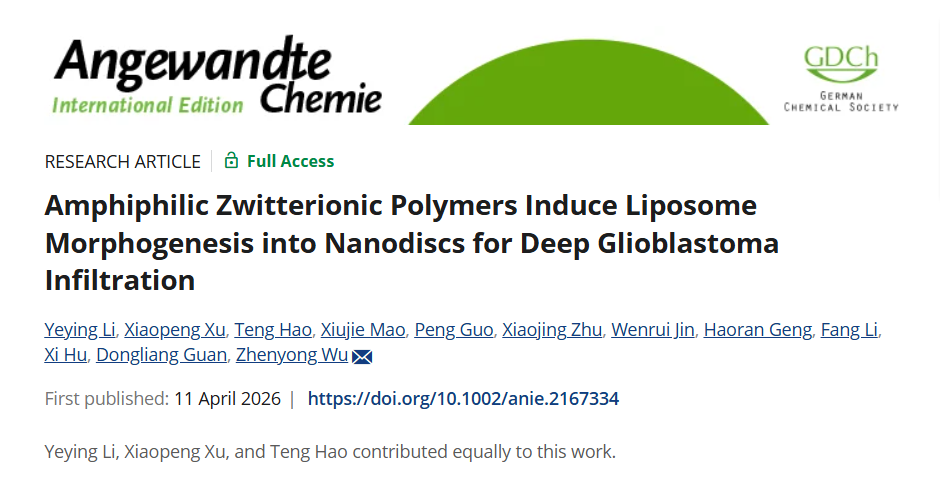 2026年4月11日,中国科学院上海药物研究所吴振永团队与烟台新药创制山东省实验室合作在Angewandte Chemie International Edition 发表题为“Amphiphilic Zwitterionic Polymers Induce Liposome Morphogenesis into Nanodiscs for Deep Glioblastoma Infiltrati