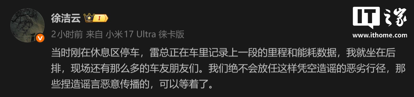 IT之家 4 月 19 日消息,小米集团董事长特别助理、战略市场部副总经理徐洁云今天在微博发文,就网络传闻“被人堵在车里维权”作出回应。徐洁云表示,当时他们刚在休息区停车,雷总(雷军)正在车里记录上一段的里程和能耗数据,他本人就坐在后排,现场还有那么多的车友朋友们。他们绝不会放任这样凭空造谣的恶劣行径,那些捏造谣言、恶意传播的可以等着了。根据微博博主 @回望风逝 今日发文,雷军当时到达盐城东台服务