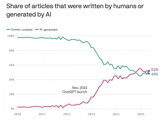 AI生成内容已超越人类原创:Graphite报告揭示创意危机 根据网络研究公司Graphite最新发布的调查报告,当前互联网上的AI生成内容已正式超过了人类原创内容。这一发现引发了人们对效率提升与创意消失之间的深思。报告指出,从2020年到2025年,研究团队对65000个网址进行了分析,结果显示,自2022年ChatGPT发布以来,AI生成的文章比例急剧上升,预计到2025年底将超过人类创作的内