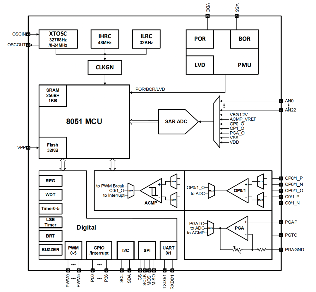 Part.1 新品介绍 BLDC(无刷直流电机)凭借其高效率、低噪音、长寿命及易于控制等优势,广泛应用于电动工具、家用电器、工业驱动、个人护理产品等领域。杭州晶华微电子全新推出的SD81F134是一款集成高性能8051内核与丰富模拟外设的SoC芯片,特别适用于BLDC电机控制。本方案充分利用其内置增强型PWM、高精度ADC、可编程增益放大器(PGA)、运算放大器(OP)及模拟比较器(ACMP),提