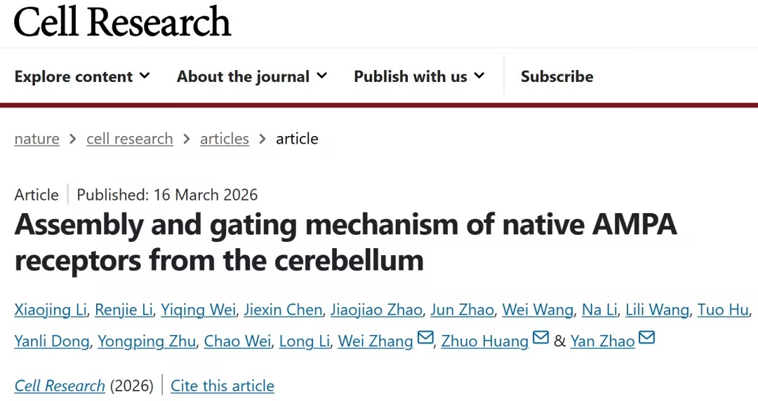 AMPA 受体(AMPARs)在中枢神经系统中负责大部分快速兴奋性突触传递。钙可渗透型 AMPARs 和含 GluA4 的受体对于小脑的功能至关重要,例如运动学习、联想记忆、听觉处理和突触可塑性。与海马体和大脑中主要含 GluA2 的 AMPARs 相比,小脑的 AMPARs 含有更高比例的 GluA4,但其机制仍不为人所知。 2026年3月16日,中国科学院生物物理研究所赵岩、北京大学黄卓及河北