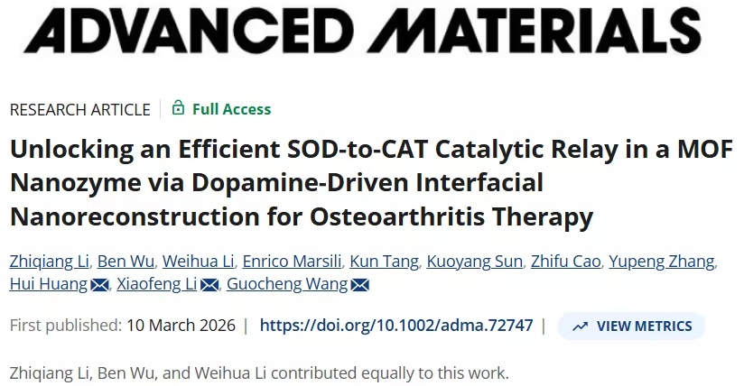 骨关节炎(OA)由炎症与活性氧(ROS)构成的恶性循环驱动。钴基金属有机框架(MOF)纳米酶是高效的过氧化氢酶(CAT)模拟物,但其类超氧化物歧化酶(SOD)活性较弱,无法实现全程ROS清除,严重制约了其治疗效果。 2026年3月10日,中国科学院深圳先进技术研究院王国成、南昌大学李晓峰、中山大学黄辉共同通讯在Advanced Materials 在线发表题为Unlocking an Effici