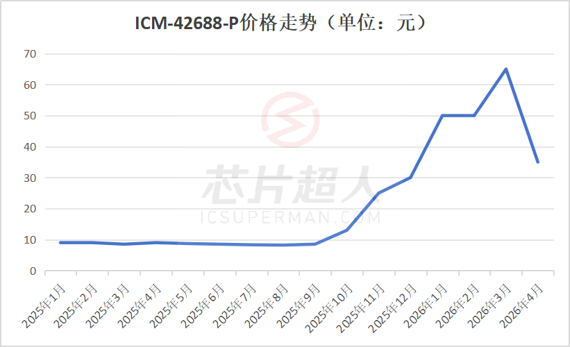 本文来自微信公众号: 芯世相 ,作者:王土土,原文标题:《从10元到近100!我终于搞懂 42688 芯片为啥火这么久?》ICM-42688-P,这颗芯片从去年9月开始便成为现货市场热门芯片的常客。行情火到今年不说,价格也一路飞涨,从不到10元,到报价喊到近100元。然而,这颗网红芯片在4月价格出现了“断崖式”下跌,一周就腰斩一半。回顾这颗芯片的行情变化,有人在这波行情里赚到了,有人到现在还在高位