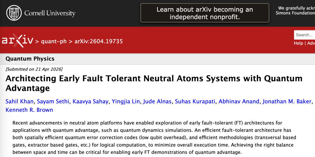 近日,一份由杜克大学、德克萨斯大学奥斯汀分校和耶鲁大学的研究团队联合提交的科研报告,向外界亮出了一组极具吸引力的数据:通过一种全新的“基于量子隐形传态的容错架构”,量子计算机有望在仅使用11,495个中性原子的条件下,在大约15小时内实现具有实际意义的“量子优势”(Quantum Advantage)。在动辄需要上百万物理量子比特的远景蓝图面前,1.1万个原子和15小时的运行时间,犹如在迷雾中为整