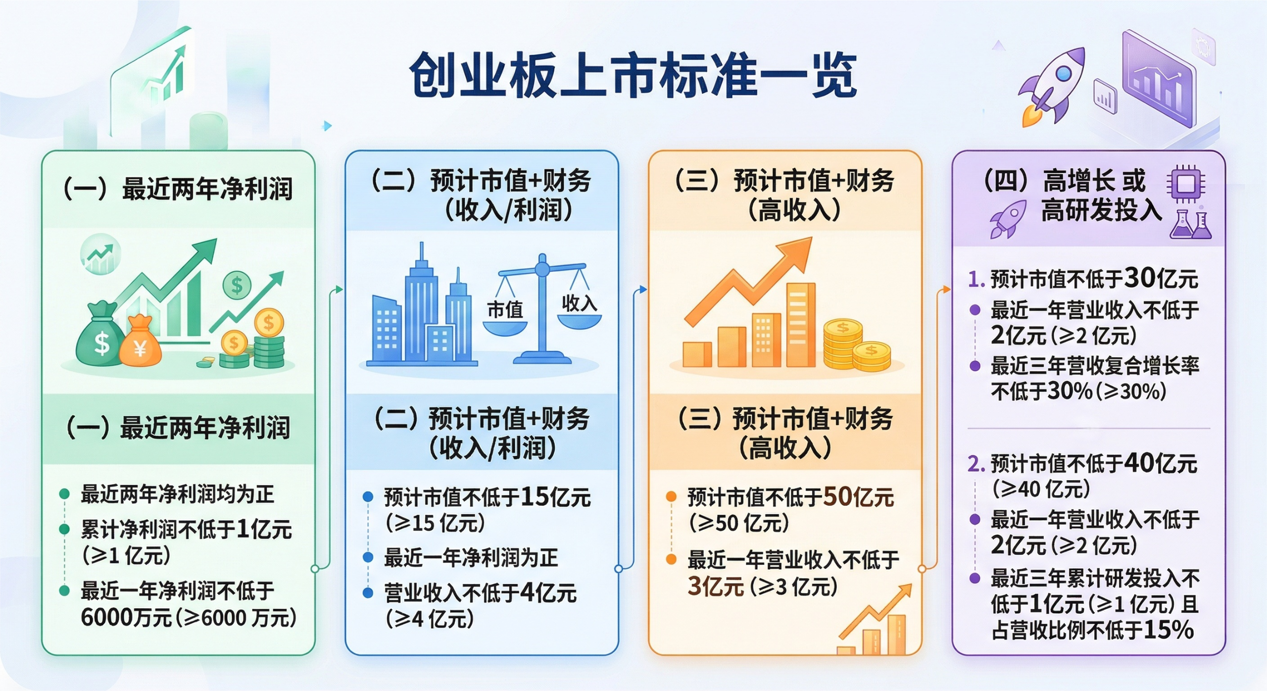 千呼万唤始出来。 4月10日,中国证监会正式发布《关于深化创业板改革 更好服务新质生产力发展的意见》,标志着创业板第四套上市标准的正式落地。 具体来看,此次增设的第四套上市标准共有两项指标: 一是“预计市值不低于30亿元,最近一年营业收入不低于2亿元,最近三年营收复合增长率不低于30%”,主要适用于新兴产业领域企业; 二是“预计市值不低于40亿元,最近一年营业收入不低于2亿元,最近三年累计研发投入