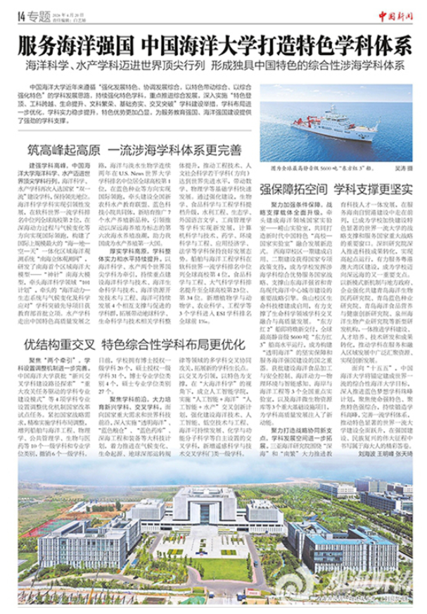 中国海洋大学近年来遵循“强化发展特色、协调发展综合,以特色带动综合、以综合强化特色”的学科发展思路,持续强化特色学科,重点推进综合发展,深入实施“特色登顶、工科跨越、生命提升、文科繁荣、基础夯实、交叉突破”学科建设举措,学科布局进一步优化,学科实力稳步提升,特色优势更加凸显,为服务教育强国、海洋强国建设提供了强劲的学科支撑。筑高峰起高原一流涉海学科体系更完善建强学科高峰,中国海洋大学海洋科学、水产