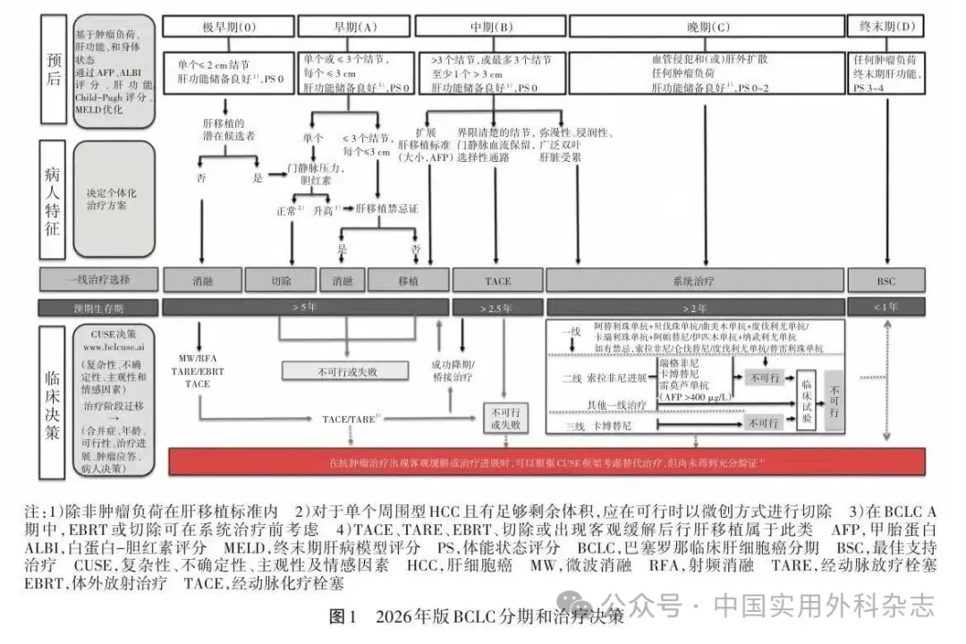 摘要 2026年版巴塞罗那临床肝细胞癌(BCLC)分期继续保持分期、预后与治疗三位一体框架的简洁性,同时纳入了治疗领域的最新进展。此次更新的亮点在于引入复杂性、不确定性、主观性与情感因素(CUSE)临床决策框架,即通过综合现有循证医学证据,系统评估复杂性、不确定性、主观性及情感因素4个维度,指导多学科团队以病人为中心作出更加科学的个体化治疗决策。在具体治疗推荐方面,BCLC 0/A期肝细胞癌新增立