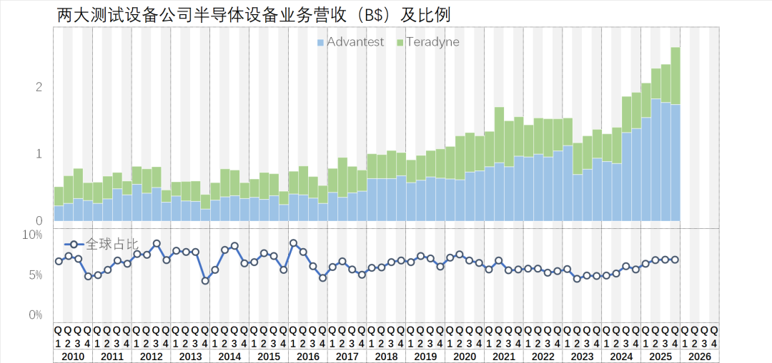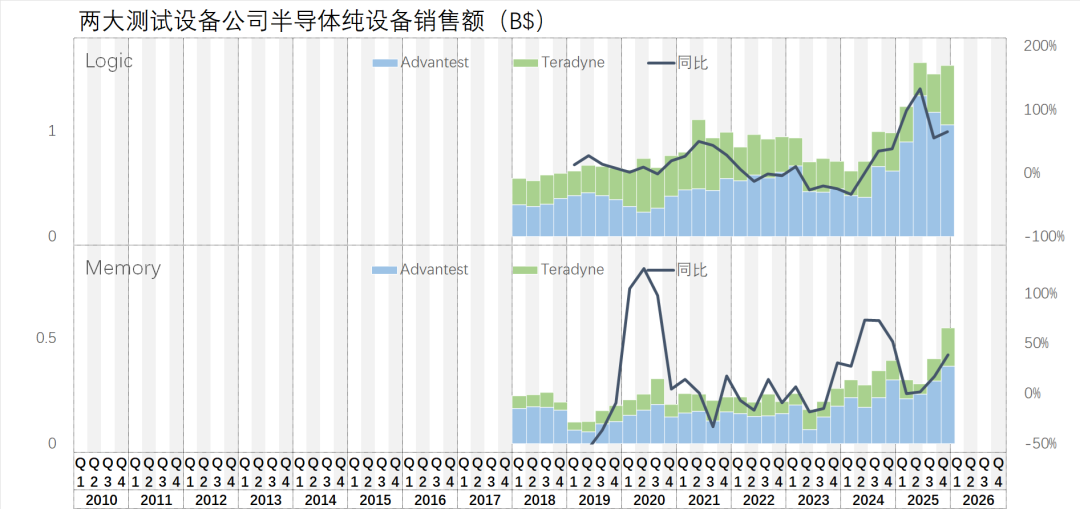 从整体的营收地域分布来看,25年中国大陆和其它地区(北美和日本)的设备购买量较大,而从Q4开始,中国台湾地区和韩国的采购量开始明显回升。这个趋势预计会覆盖整个26年25年总体而言,三家企业的营收趋势都一般。虽然ASMPT同比增加较多,但在25年年内的4个季度走势并不好不过Q4中,KNS和BESI还是由较明显的增加,看起来其26年的趋势有转暖迹象。总体而言,三家供应商在26年的增速应该好于25年25年毫无疑问是测试设备的超级大年。随着AI的兴起,日本爱德万Advantest(英伟达的主要供应商)基本吃到了算力芯片和存储器的最大红利,使得他家在24、25年的业绩飞速暴涨而泰瑞达Teradyne的业务也在25年下半年有了明显起色。他的半导体营收增加主要原因可能是部分算力芯片公司的转单和苹果的新订单关于为什么测试设备吃到算力市场红利最多的原因,我在之前的文章里有过解释。有兴趣的朋友可以通过以下链接参考:另外,我从四大前道设备商以及两大测试设备商的财报里提取了Logic和Memory市场各自的设备销售情况供大家参考很明显,25年Logic制造的产能在持续增长;而Memory的设备出货量相对稳定,增加较小。这也一定程度上导致了当下存储器市场的供不应求的状态所幸的是,25年Q4开始Memory相关的设备出货量有明显抬头,预计26年这个趋势会一直延续。不过这些设备出货后形成产能还需要一定时间。考虑到现在存储器的严重缺货状态,供需紧张的状态至少要持续到27年了- 本文中所展示数据仅包含各家半导体业务的营收(面板、PCB等非半导体行业营收不包含在内)