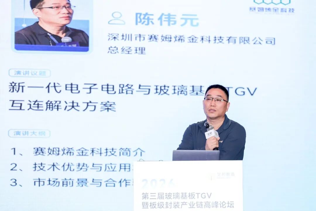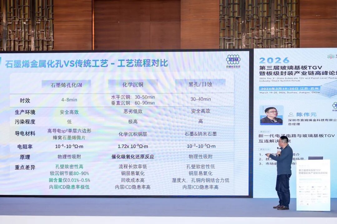 随着全球电子信息产业的飞速发展,传统的PCB及半导体封装领域正面临生态环保与技术瓶颈的双重挑战。如何实现电子电路及先进封装基板的高效、低碳、可靠金属化互连,已成为行业关注的焦点。在本次论坛上,赛姆烯金科技发表了题为《新一代电子电路与玻璃基板TGV互连解决方案》的主题演讲。报告深入剖析了现行化学镀铜工艺的痛点,并重磅推出了自主研发的创新型绿色环保电子制造技术——石墨烯金属化技术,为电子电路及玻璃基板TGV互连提供了极具竞争力的替代方案。