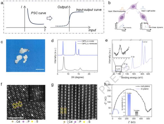 1) CdPS3-Li的分层结构有助于Li+存储的各向异性离子传输,并产生强烈的离子-电子耦合,从而在电脉冲下产生高线性和非易失性电阻状态。此外,CdPS3-Li中的Cd空位吸引并捕获MoS2中的光生空穴,导致光脉冲下丰富的非线性行为。