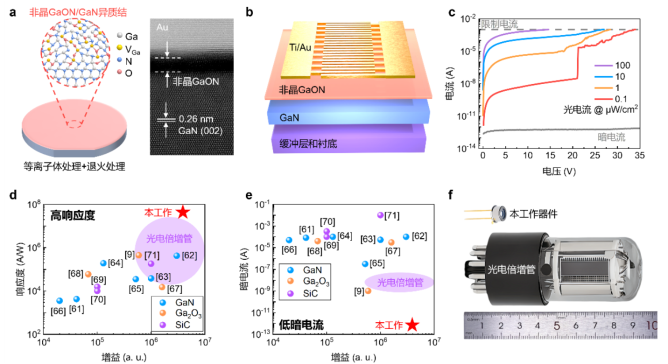图1:类雪崩倍增效应赋能的高灵敏度紫外探测器:(a)非晶GaON/结晶GaN异质结构示意图及透射电子显微镜图片,(b)器件结构示意图,(c)器件在不同光强下的电流-电压特性,(d)响应度性能对比,(e)暗电流性能对比,(f)本工作器件与商用光电倍增管的尺寸对比。