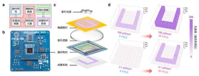 基于研制的器件阵列,研究团队进一步开展了硬件紫外成像应用的概念验证。团队首先设计了完整的硬件与软件系统架构(图2a),并制备了用于器件阵列寻址读出的板级电路(图2b),构建出紫外成像系统(图2c)。在35 V工作电压下,器件触发类雪崩光电流倍增效应,使阵列能够实现对微弱紫外光信号的有效探测,并显著提高成像图案的信噪比(图2d)。该结果展示了这种高灵敏度紫外探测器阵列在弱紫外光成像应用中具有良好的性能表现与广阔的应用潜力。