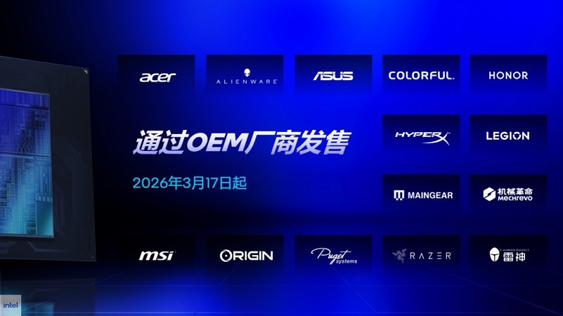 酷睿 Ultra 200HX Plus的系统将于2026年3月17日起由OEM合作伙伴陆续推出。详情可咨询相关厂商,合作伙伴系统包括并不限于:宏碁、华硕、七彩虹、戴尔、荣耀、惠普、联想、MAINGEAR、机械革命、微星、Origin、Puget、雷蛇、雷神。