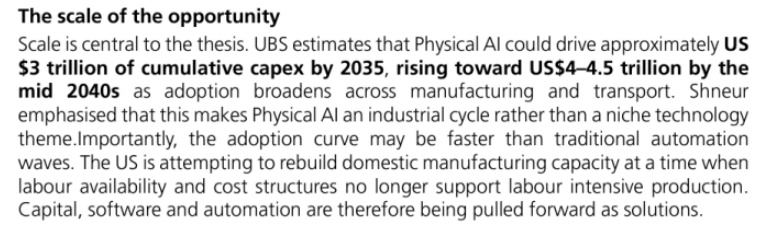 首先,边缘AI和物理AI的机会很大。与装备动辄上万张英伟达高性能GPU卡或者华为昇 腾超节点的、基于大模型的AI智算中心不同,边缘AI利用其处于网络边缘从而具有更高能效、更高实时性、更好隐私保护、更高集成度以及更高成本效益,可以广泛应用于我们工作和生活的方方面面;而物理AI更是以具身智能等方式快速发展,成为改变产业经济和社会服务的新动能。例如,据瑞银(UBS)测算,到2035年,物理AI有望推动累计约3万亿美元的资本支出;到2040年代中期,随着制造和交通领域的应用持续普及,这一规模将进一步攀升至4万亿—4.5万亿美元。