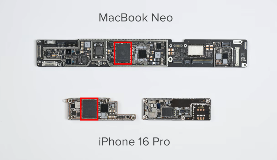 如果将Macbook Neo 的主板和 MacBook Air M3 的主板放在一起比较,区别就显而易见了。