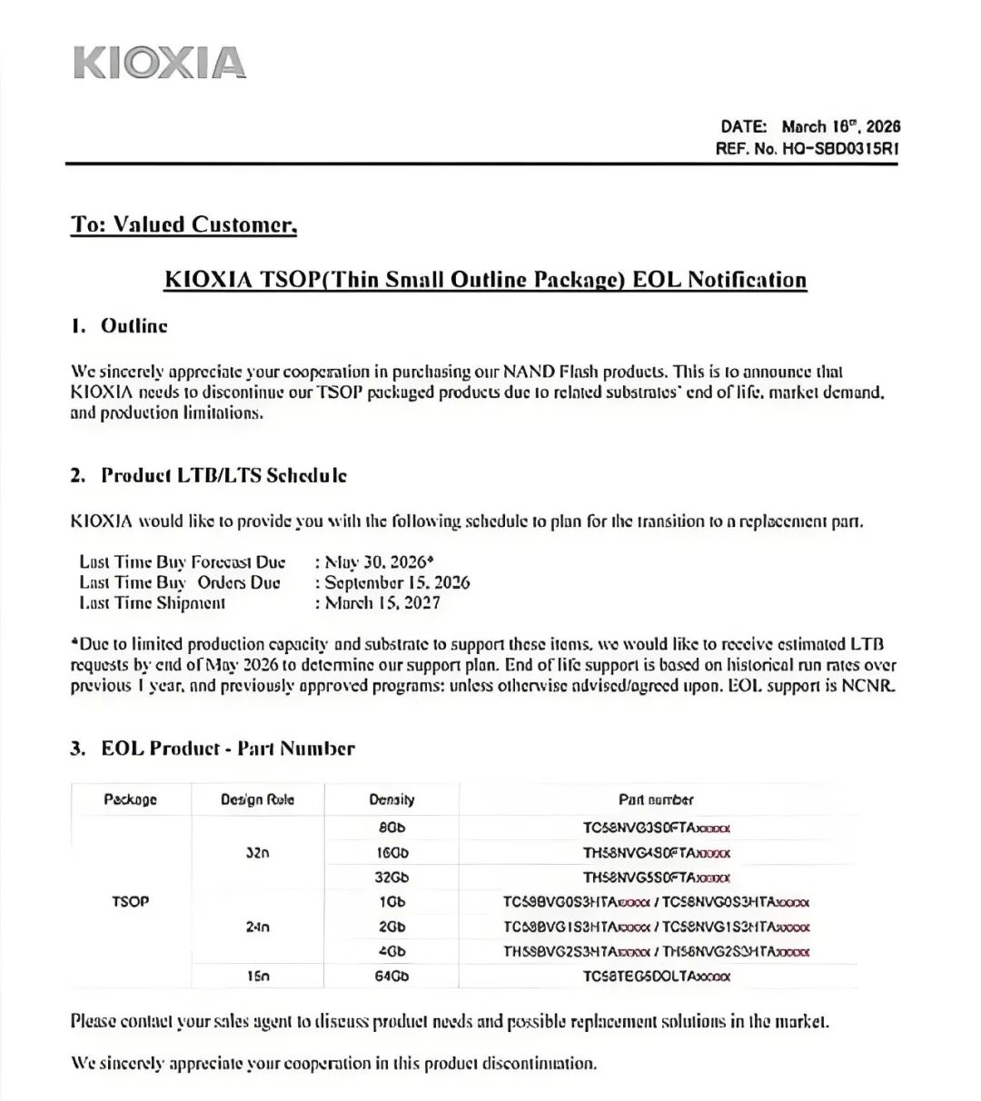 3月19日,铠侠电子(中国)有限公司正式向客户发出通知,宣布将逐步停止生产采用“薄型小尺寸封装”(TSOP)的MLC NAND闪存产品。这一决定不仅标志着这家存储大厂进一步退出低密度NAND市场,也预示着全球工业级与车规级应用领域长期依赖的可靠型存储方案正加速走向终结。