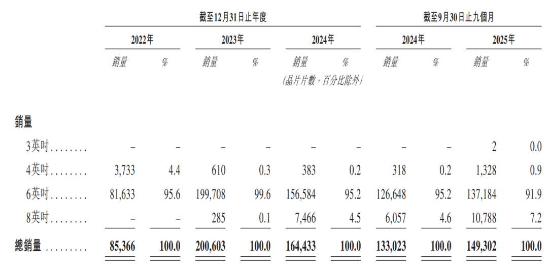 按外延片类型拆分,6英寸外延目前仍是瀚天天成的销售主力,2022年至2025年前九个月,其销量始终占据总销量的绝对主导地位,是瀚天天成营收和销量的核心支撑。