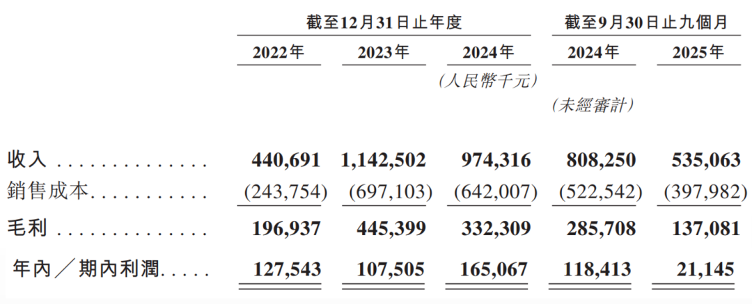 具体来看,2022年至2025年前9个月,瀚天天成营收分别为人民币4.41亿元、11.43亿元、9.74亿元以及5.35亿元。期间利润分别为人民币1.28亿元、1.08亿元、1.65亿元以及0.21亿元。