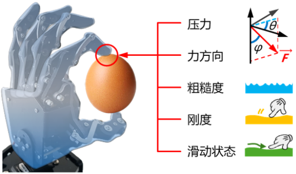 更核心的突破在于传感器的三维力解耦能力。金字塔结构在法向力下,底面产生对称的偶函数压力分布;在剪切力下,则产生反对称的奇函数压力分布(图4A)。通过在传感器底部镀四个对称电极测量压力,即可实时计算法向力(正比于压力均值)和切向力(正比于压力梯度)的大小与方向(图四B)。实验结果显示,传感器的力方向测量误差<3°,力大小误差<3.1%。此外,传感器还能通过摩擦力变化导致的剪切力突变检测滑动,并通过滑动中的电位波动幅度线性估计表面粗糙度(R2 = 0.96)(图五)。