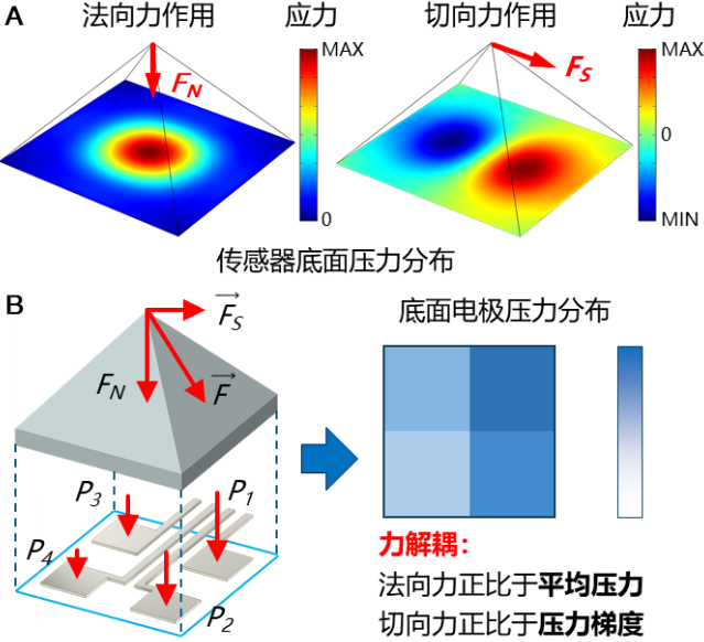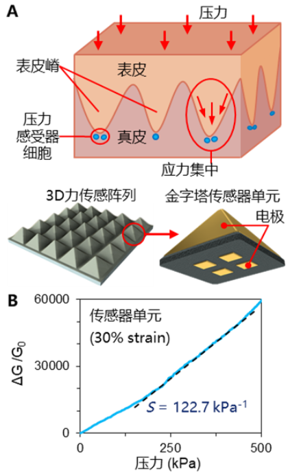 图三、(A)仿真皮层的传感器结构设计和(B)传感器的电导-压力响应曲线