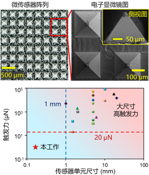 进一步地,团队开发了单元尺寸仅200 μm的微型传感阵列(图七),其最低检测极限(触发力)仅为一粒沙子的重量(μN级),远超世界先进水平。通过与微小物体接触时的三维力分布,微传感器阵列成功展示了对不同金属球的尺寸和密度识别。该微传感器为微操作机器人提供了超越人体皮肤的触觉感知能力。