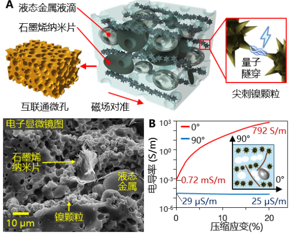 研究团队首先聚焦于材料创新,将多刺镍微米颗粒、多层石墨烯纳米片和液态金属微液滴复合于多孔PDMS基体中,并通过磁场诱导镍颗粒定向排列,得到具有动态各向异性固-液导电网络的各向异性多孔弹性体(图二A)。材料变形时,液态金属作为动态网络的核心随基体变形,并保持与周围导电颗粒的接触;超薄的石墨烯纳米片则作为导电网络的柔性桥梁。