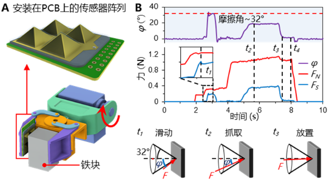 图六、(A)安装三维力传感阵列的机械臂。(B)机械臂实现铁块的智能转移。