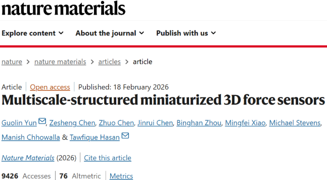 如何让机器人拥有媲美人类指尖的触觉?中国科学技术大学贠国霖特任教授与剑桥大学Tawfique Hasan教授合作,在柔性传感领域取得重大突破。团队通过多尺度力学结构设计,开发出基于石墨烯-液态金属协同复合材料的微型化三维力传感器阵列,其性能全面超越现有技术。相关成果以“Multiscale-structured miniaturised 3D force sensors”为题,于近日登上材料学顶刊《自然·材料》(Nature Materials)。