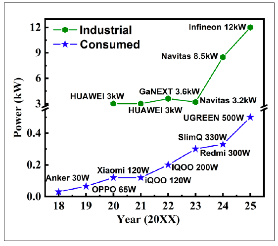 无论是消费级氮化镓快充还是工业级氮化镓服务器电源,其输出功率均呈现出显著的增长趋势。