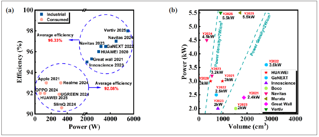 图3:(a)工业级和消费级氮化镓电源效率-功率图;(b)工业级氮化镓电源功率-体积图