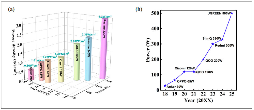 图2:近几年消费类氮化镓快充(a)功率密度增长情况;(b)功率增长情况