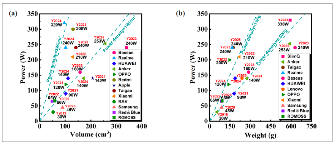 从质量数据分布图 1 (b)来看,2018 年,Anker 推出的首款 30 W 氮化镓快充,质量 54 g,功率密度仅 0.53 W/g。2022 年,OPPO 发布 200 W 氮化镓快充,其质量为 147 g,功率密度达 1.36 W/g,成为首个突破 200 W 且功率密度超 1 W/g的快充产品。Realme 和 Taigao 分别在 2024 年和2025 年推出 240 W 氮化镓快充,功率密度分别达到 1.44 W/g 和 1.37 W/g,树立了行业新典范。