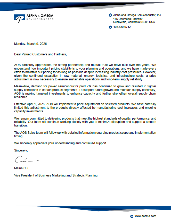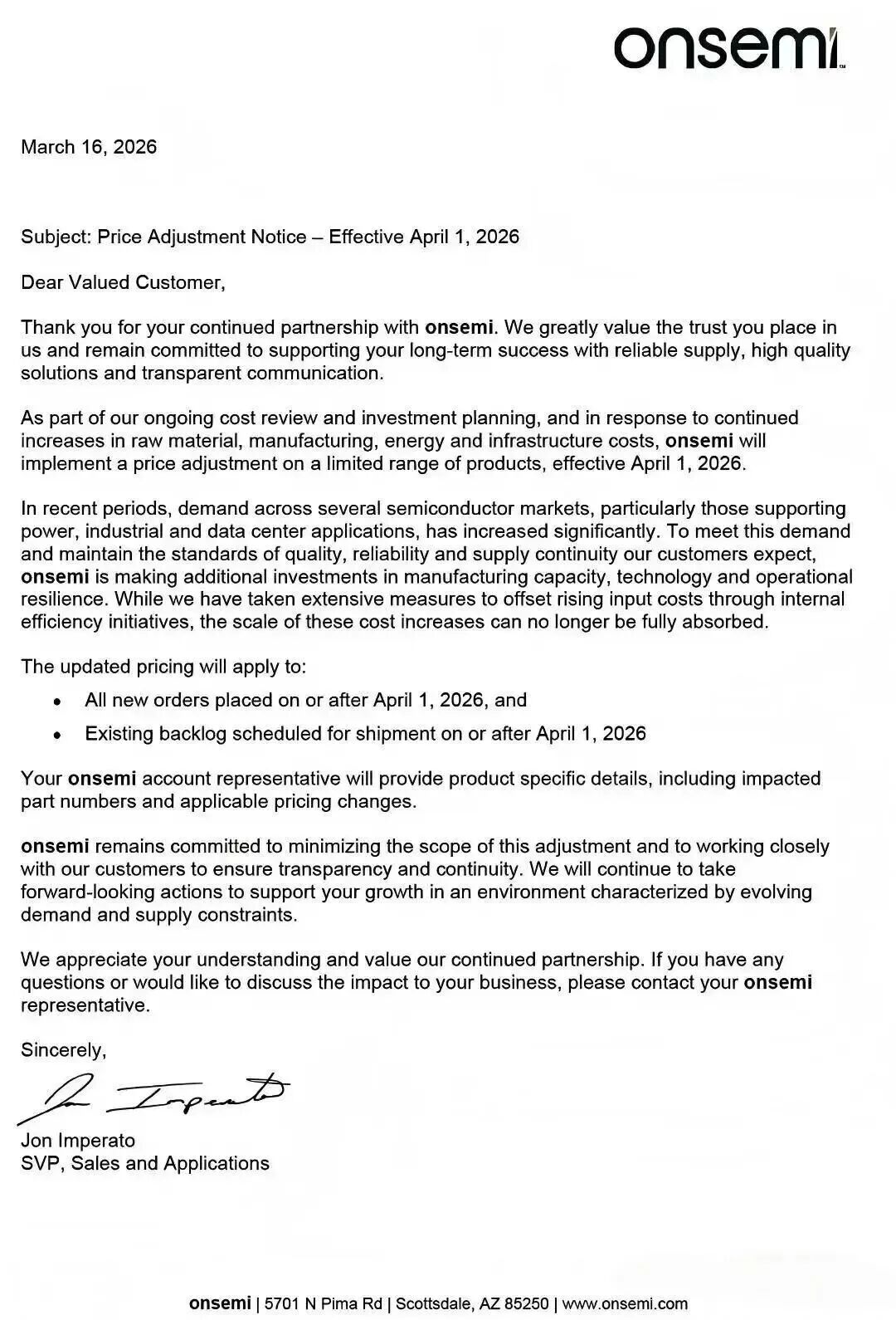 2月5日,通知上写明,受AI数据中心部署带动,其功率开关与集成电路产品需求大涨、出现缺货。因扩产需大幅追加晶圆厂投资,叠加原材料与基建成本持续上涨,公司将自2026年4月1日起调整部分产品价格。