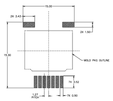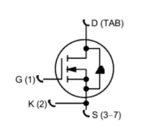 图4所示为T2PAK推荐的PCB焊盘布局。在封装顶视图中,引脚定义如下:右下角为引脚1(栅极),引脚2为开尔文源极(用于驱动参考电位),引脚3至7为源极连接。漏极则通过延伸的大型漏极焊片实现电气连接,该焊片与封装顶部中央的外露漏极焊盘相连,共同构成主散热区域。