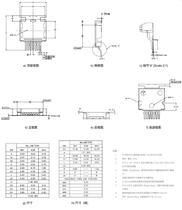 T2PAK封装轮廓详见图3所示。其中,图3a与图3b分别为封装顶视图与侧视图;细节A进一步展示了引脚尺寸,对应侧视图(图3c)、正视图(图3d)与后视图(图3e);底视图见图3f。所有相关尺寸标注于图3g和图3h。封装主体尺寸约为11.80mm×14.00mm×3.63mm(D×E×A),含引脚的整体平面尺寸为18.50mm×14mm(H×H1)。