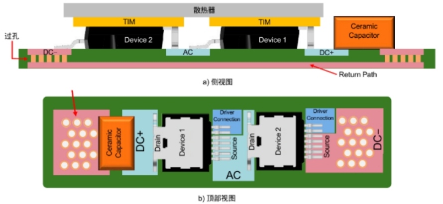 相比之下,底部散热封装依赖PCB底层铜箔进行散热,这限制了底层电气布线。此限制使得难以构建紧凑的换流回路,往往导致走线路径更长、寄生电感更高。由于底层必须专用于散热——通常需通过大量热过孔和大面积覆铜实现——将回流路径紧邻电源回路布线变得不切实际。这会削弱磁通量抵消效果,增加回路电感,从而对开关性能产生不利影响。
