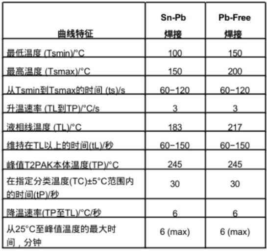 T2PAK封装兼容锡铅(Sn-Pb)和无铅(Pb-Free)焊接工艺,但两种工艺需采用不同的热温度曲线。Sn-Pb焊接采用熔点较低的共晶合金焊料(183℃),而Pb-Free焊接(通常使用SAC305合金)则需要更高的液相线温度(217℃)及高达245℃的峰值回流温度。根据焊接指南,两种工艺均建议预热温度范围(Tsmin至Tsmax)为:Sn-Pb为100-150℃,无铅焊料为150-200℃,预热时间为60-120秒。升温速率不得超过3℃/s,液相线以上停留时间应维持在60-150秒。T2PAK封装的峰值本体温度需达245℃,并在峰值温度5℃范围内保持30秒。降温速率应控制在6℃/s,从环境温度到峰值温度的总耗时不得超过6分钟。合理预热与温度控制至关重要,尤其对无铅工艺而言,可最大限度降低热应力并确保焊点可靠性。