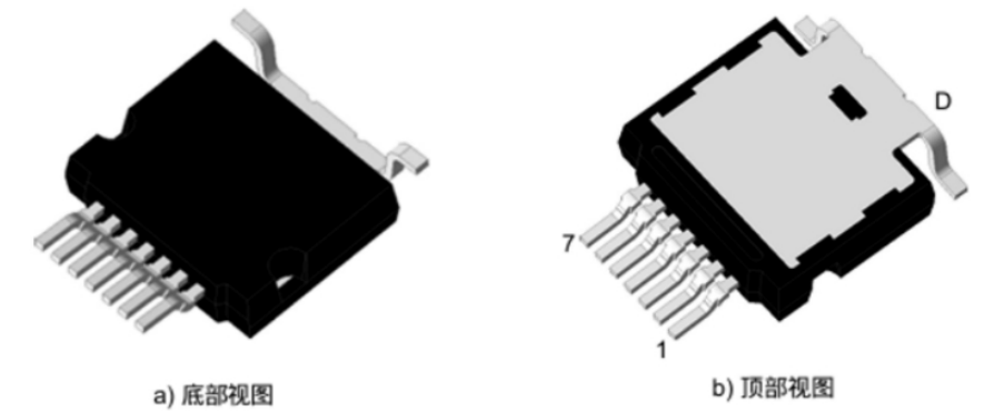 附图方面,图1a与图1b分别展示了封装的底部与顶部视图,图2为引脚配置图。其中在图1b中,各引脚定义如下:引脚1为栅极,引脚2为Kelvin引脚,引脚3至7为源极,漏极引脚则标记为D。