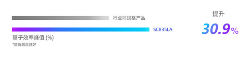 SC835LA和SC1635LA采用了BSI技术和掩膜拼接工艺,实现了感光性能的显著优化。例如,在可见光波段下,SC835LA黑白模式的量子效率峰值(QE peak)可达95.8%,较行业同规格竞品提升约30.9%。凭借优化的感光性能,产品在低照度环境下仍可输出细节清晰的高质量画面,为工业检测系统的全天候运行提供可靠、稳定的图像数据支持。