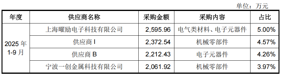 其中,上海曜励电子科技有限公司主要向宇树科技供应电气类材料、电子元器件;宁波一创金属科技有限公司主要向宇树科技供应机械零部件、基础材料;供应商B主要向宇树科技供应电子元器件;供应商I 主要向宇树科技供应机械零部件。