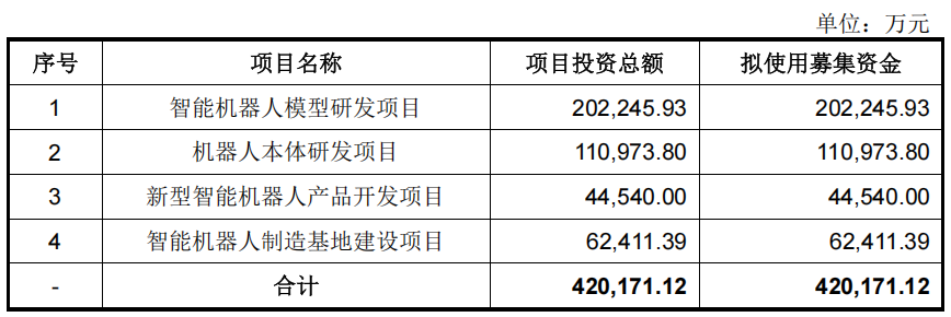 宇树科技计划募资42亿,其中,约20.22亿元用于智能机器人模型研发项目,11.10亿元用于机器人本体研发项目,4.45亿元用于新型智能机器人产品开发项目,6.24亿元用于智能机器人制造基地建设项目。